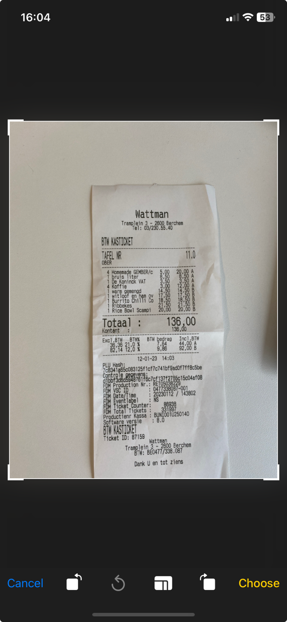 - Lors du scanning, une photo est automatiquement prise si le document est correctement positionné. Vous pouvez déjà ajuster la photo en la découpant, en la colorant ou en la faisant pivoter vers la gauche ou vers la droite.