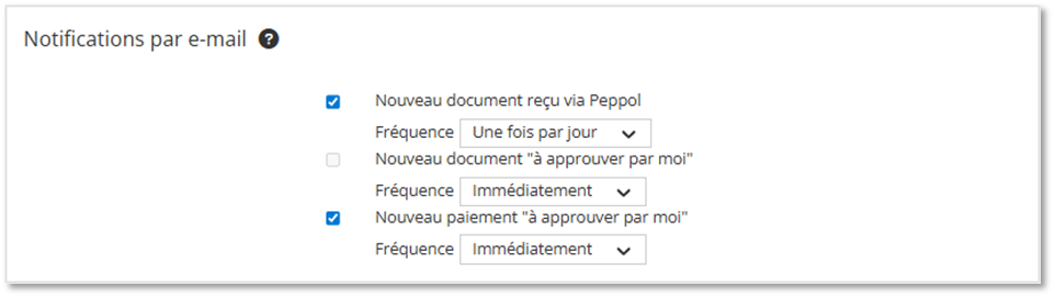 Il est possible de recevoir une notification par e‑mail lorsque vous devez effectuer une action ou lorsque vous souhaitez être informé des documents que vous recevez via Peppol.