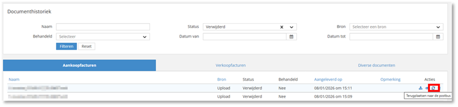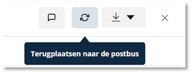 Voor de documenten met de status “Verwijderd” kan je een document terugplaatsen door het icoon “Terugplaatsen naar de postbus” aan te klikken. Je kan dat ook vanuit de document preview via hetzelfde icoon bovenaan.