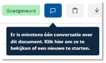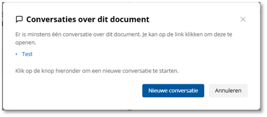 Als er al één of meerdere conversaties over dit document aan de gang zijn, is de tekstballon gekleurd en als je erop klikt, krijg je een overzicht van de andere conversaties. Je kan de bestaande conversatie verder zetten door op de betreffende link te klikken of je kan een nieuwe conversatie starten.
